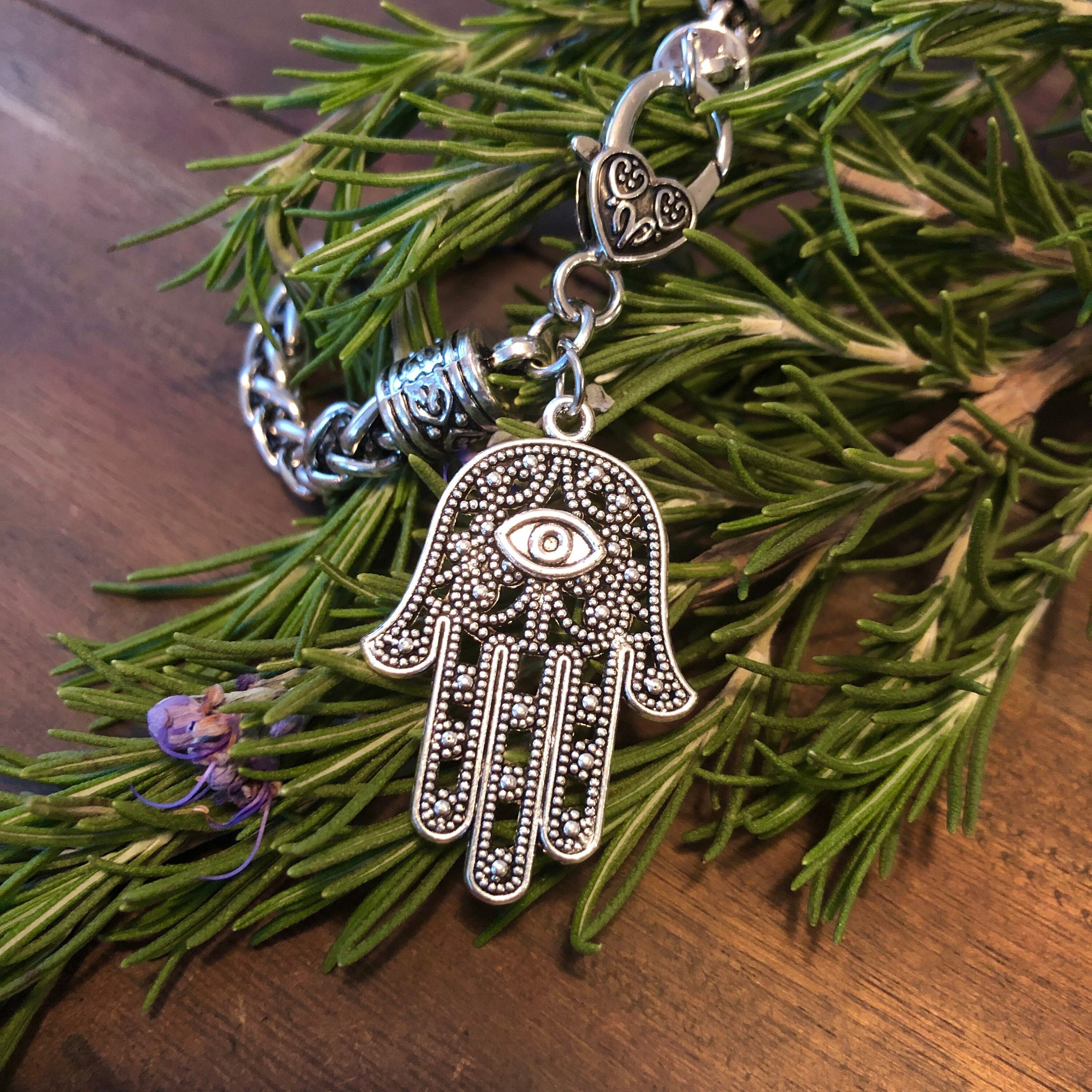Sterling Silver Link Chain Crystal Palm Hamsa Bracelet, Evil Eye Hamsa Charm Bracelet, Evil Eye Fatima Bangle, Evil Eye Protection Charm, Evil Eye Jewelry
